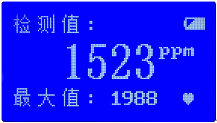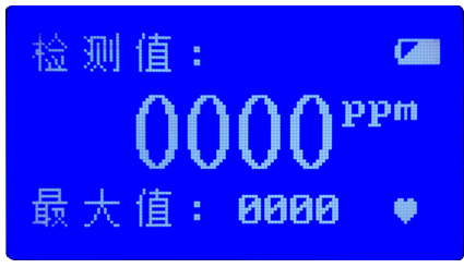 如圖所示,儀器初始化完成進(jìn)入待機(jī)狀態(tài)這時(shí)“?"不會(huì)閃爍。待機(jī)界面會(huì)顯示“檢測(cè)值:0000ppm",“大值: 0000",電池電量。