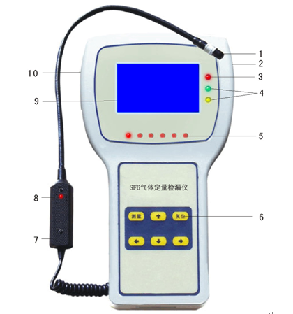 1、探頭 2、電源開(kāi)關(guān) 3、充電指示燈 4、電池電量指示燈 5、聲光報(bào)警指示燈 6、按鍵 7、探頭手柄 8、工作指示 9、液晶顯示屏 10、充電插座